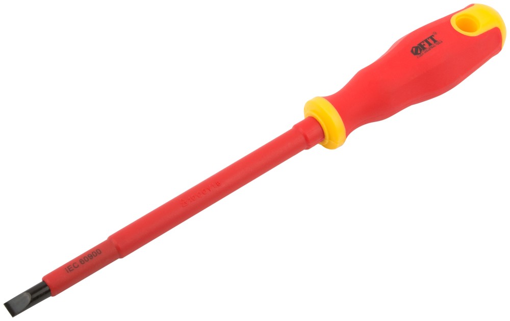 Изолированная отвертка CrV 1000V SL 6.5х150 мм FIT 55899 подходит для закручивания и откручивания болтов, для монтажа и работы с напряжением до 1000V. Стержень изготовлен из высокопрочной стали с добавлением хрома и ванадия. Прорезиненная ручка препятствует выскальзыванию инструмента во время работы.