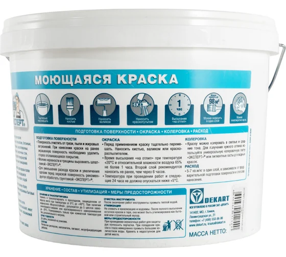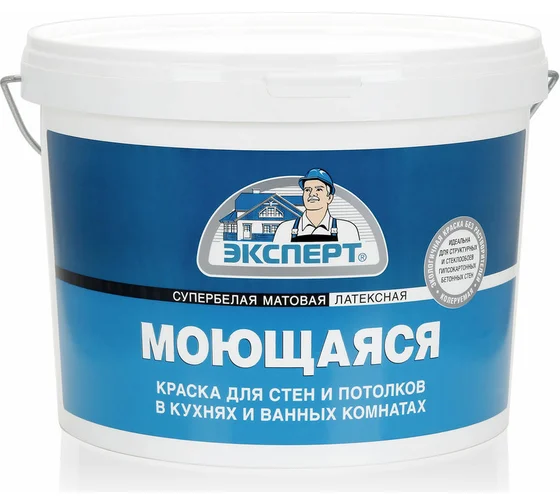 Моющаяся краска Эксперт применяется для окраски стен и потолков в кухнях, ванных комнатах. Идеальна для структурных и стеклообоев. Обладает высокой степенью белизны и укрывистости. Очень хорошая стойкость к влажному истиранию, экономичная в применении. Наносится на бетонные и оштукатуренные поверхности, гипсовые и гипсокартонные плиты, структурные и стеклообои. ОСОБЕННОСТИ: Для внутренних работ Рекомендуется для окраски стен и потолков в кухнях и ванных комнатах Наносится на бетон, штукатурку, кирпич, гипсокартон, обои под покраску Идеально подходит для структурных обоев и стеклообоев Выдерживает влажную уборку с применением неабразивных бытовых моющих средств Высокая степень белизны и укрывистости Отличается высокой экономичностью применения Возможна ручная колеровка акриловыми колорантами или пигментами для красок на водной основе