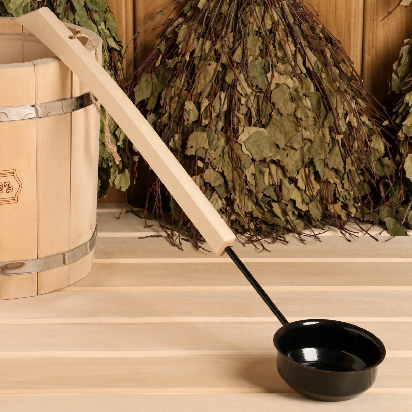 Ковш-черпак объёмом 0,2 л с деревянной ручкой предназначен для использования в бане и сауне. С его помощью можно подавать воду в каменку, наливать воду в вёдра, шайки или запарники.