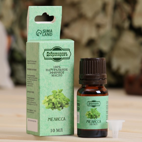 Возможно, имелось в виду эфирное масло «Мелисса» в флаконе-капельнице объёмом 10 мл. Некоторые свойства продукта: помогает избавиться или существенно уменьшить головные боли и устранить головокружения; оказывает губительное действие на вирусы, подавляет развитие микробов и снимает воспаление; снижает уровень стресса в организме и нормализует сон. Рекомендованные дозы: для бани: развести 4–5 капель масла в ковше горячей воды и сбрызнуть составом каменку; 5 для аромалампы: 5 капель; для пульверизатора: добавить в воду 4–5 капель и распылить внутри помещения; для саше: 1–2 капли. Перед началом использования эфирного масла необходимо провести тест на отсутствие аллергической реакции.