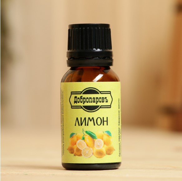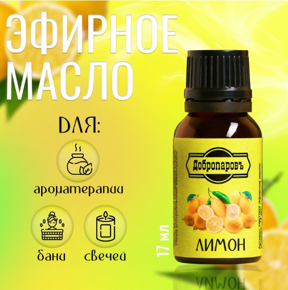 Эфирное масло «Лимон» в флаконе-капельнице от бренда «Добропаровъ». Эфирное масло «Лимон» «Добропаровъ»: объём флакона — 17 мл; обладает горьковатым свежим ароматом, успокаивающим и антисептическим эффектом; укрепляет иммунитет; понижает давление; отбеливает и разглаживает кожу, выводит токсины; успокаивает, снимает раздражение, убирает воспаления и покраснения кожи.