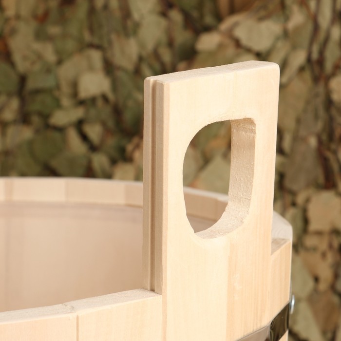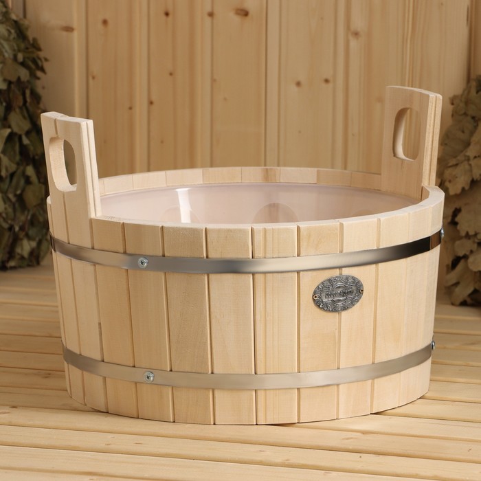 Шайка-таз из липы объёмом 15 л с пластиковой вставкой. Преимущества липы как материала: имеет красивый цвет и приятный аромат, который ассоциируется с баней, долговечна, не выделяет смолу, легко поддаётся обработке.