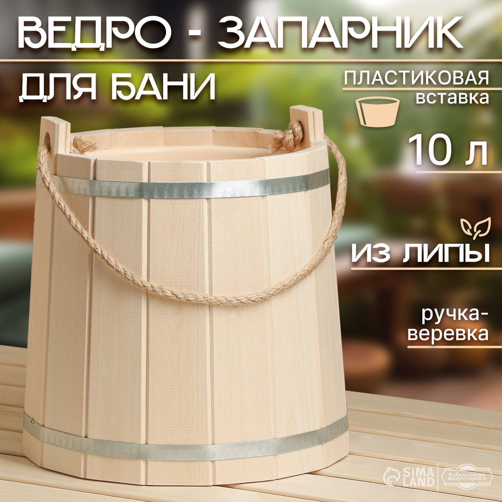 Ведро из липы объёмом 10 л с пластиковой вставкой и ручкой-верёвкой предназначено для использования в бане. Липа, из которой изготовлено ведро, легко поддаётся обработке и подходит для отделки бани и изготовления элементов её интерьера.