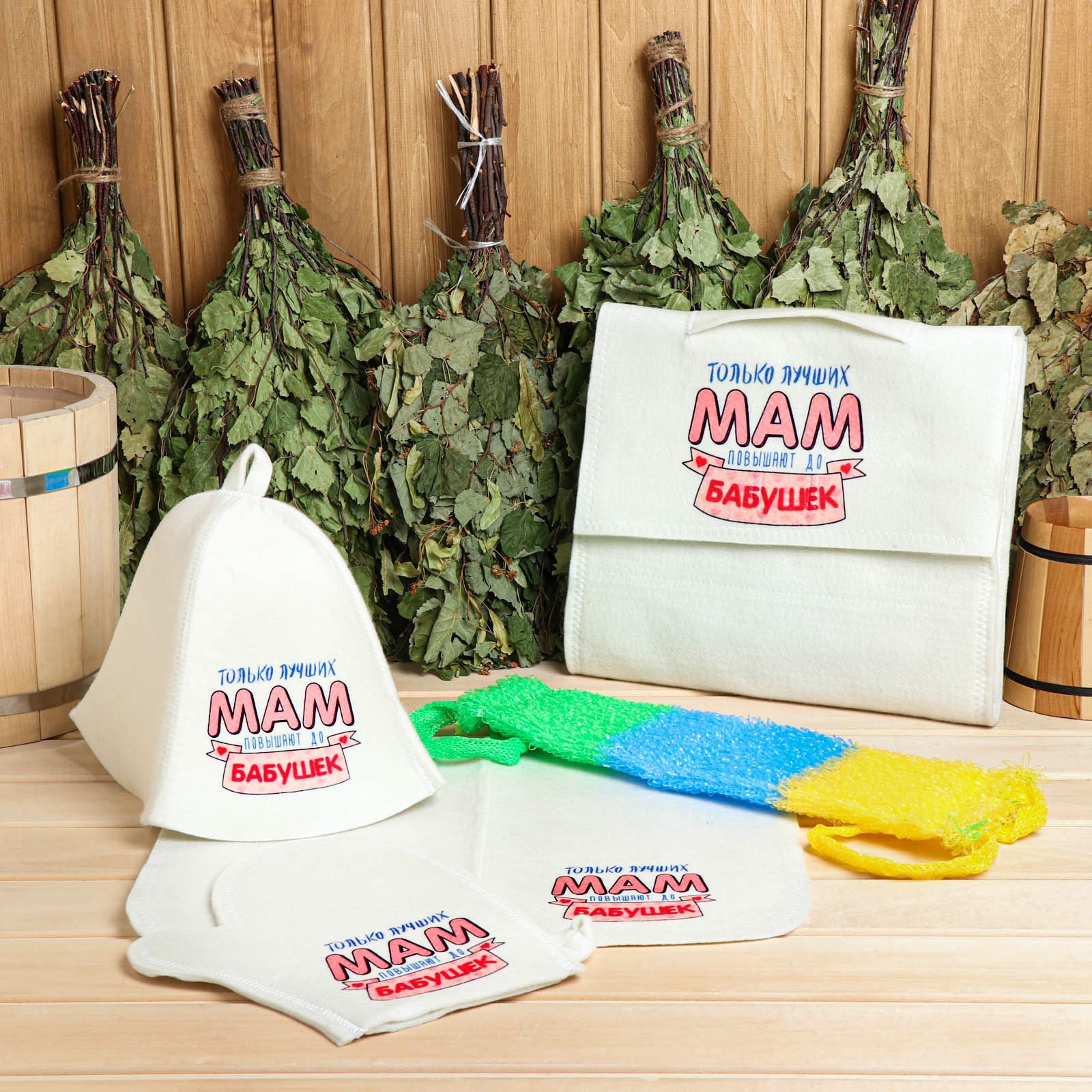 Набор для бани и сауны 5 в 1 «Только лучших мам» предназначен для комфортного отдыха в парной. Предметы из комплекта предохраняют тело от перегрева и являются средствами индивидуального пользования. В набор входят: сумка, шапка, варежка, коврик, мочалка. Материал: войлок. Содержание шерсти: 50%.