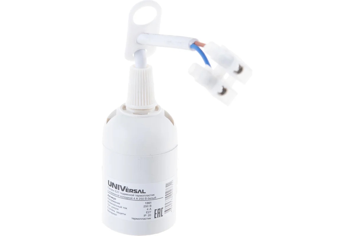 Патрон подвесной E27 имеет клемму для присоединения провода, провод и защиту от натяжения. Приспособление широко используется для временного использования - проведения строительных, ремонтных или отделочных работ. Напряжение: 220-240 В Частота тока: 50/60 Гц Номинальный ток: 4 А Материал: ПБТ пластик Цвет: черный