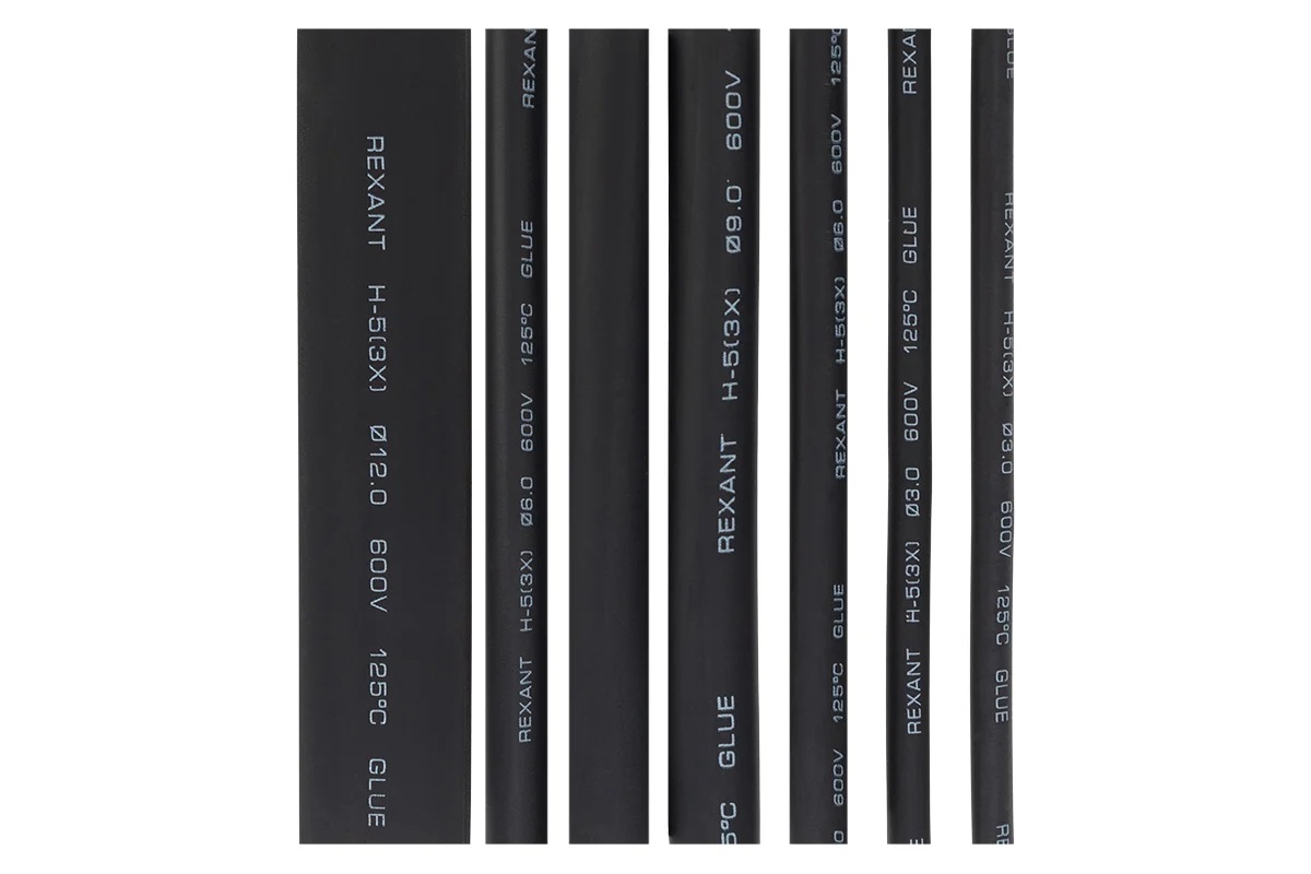 Термоусаживаемые трубки GLUE 3:1 REXANT подобраны для использования в ситуациях требующих максимально прочного и герметичного соединения. Назначение: для восстановления поврежденной и создания новой изоляции, герметизации поверхностей электрических соединений кабелей и проводов, бандажирования и маркировки проводов, для создания антикоррозийных, защитных и декоративных покрытий Состав набора: 3 мм - 2 шт(черный) 6 мм - 2 шт(черный) 9 мм - 2 шт(черный) 12 мм - 1 шт(черный) 1. Длина: 10 см. 2. Коэффициент усадки 3:1. 3. Температура усадки: +90°С…+125°С 4. Рабочая температура: -55°…+135°С 5. Не содержет галогенов 6. Нетоксично 7. Термоплавкий клеевой слой по всей длине на внутренней поверхности. Отличается высокой гибкостью; материал(полиолефин), из которого изготовлена трубка, экологически безопасен. Уникальным свойством термоусаживаемых трубок с клеевым слоем является их способность менять свой диаметр, сжиматься в результате нагрева и принимать форму предмета или материала, на который сов