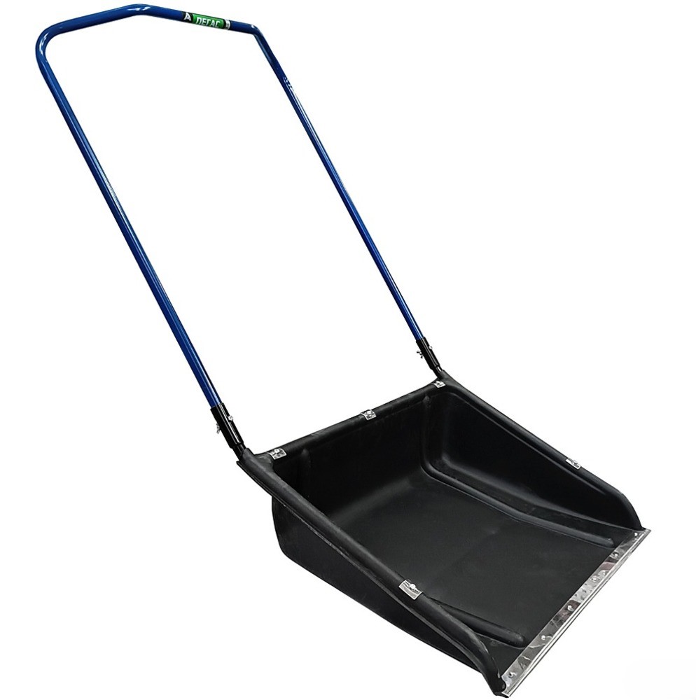 Скрепер волокуша для ручной уборки снега. Черный ковш, синий толкатель без резиновых ручек. Наилучшее решение, как для частных домов, загородных коттеджей, так и для городских служб и предприятий, где не может пройти спецтехника. Направляющие полозья каркаса ковша исключают контакт корпуса ковша с твердой основой убираемой территории, что предохраняет ковш от истирания. Дополнительную жесткость каркасу ковша придают металлические треугольные соединения. Толкатель (рукоятка) легко вставляется в рамку ковша, надежно фиксируется. Для усиления гиба в боковинах каркаса использован метод гиба «труба в трубе». Корпус ковша скрепера выполнен методом вакуумного формования из ПНД (полиэтилен низкого давления, не хрупкий пластик), ударопрочный, морозостойкость до -40°С. Каркас ковша и рукоятка изготовлены из высококачественной трубы Ø 22мм. Рабочее лезвие изготовлено из нержавеющей стали, на 6-ти заклепках. Высота борта 180мм.