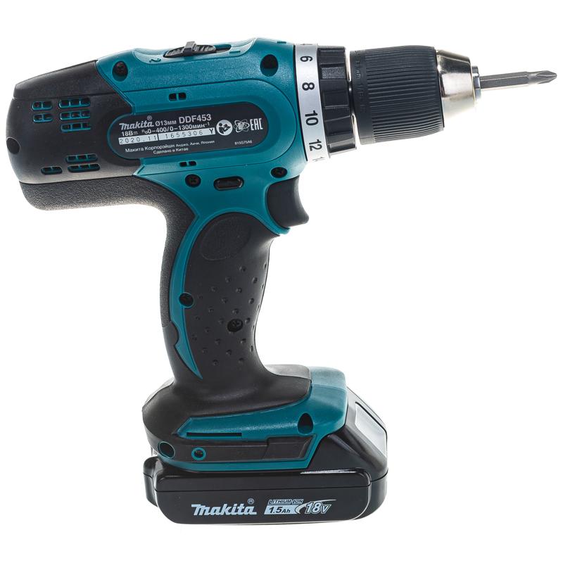 Аккумуляторная дрель-шуруповерт Makita DDF453SYX5 с напряжением 18 вольт. У шуруповерта быстрозажимной патрон на 13 мм. Сила затягивания 42 Нм, что позволяет работать шуруповертом не только дома в быту, но и в профессиональных сферах. У DDF453SYX5 предусмотрена защита от перегрузки и низкого напряжения аккумулятора. При срабатывании этих функций инструмент автоматически отключается. У Makita DDF453SYX5 есть две скорости, реверс и 16 положений установки крутящего момента. Дрель-шуруповерт Makita DDF453SYX5 поставляется в коробке с одним аккумулятором 1.5 Ач, зарядным устройством и битой.