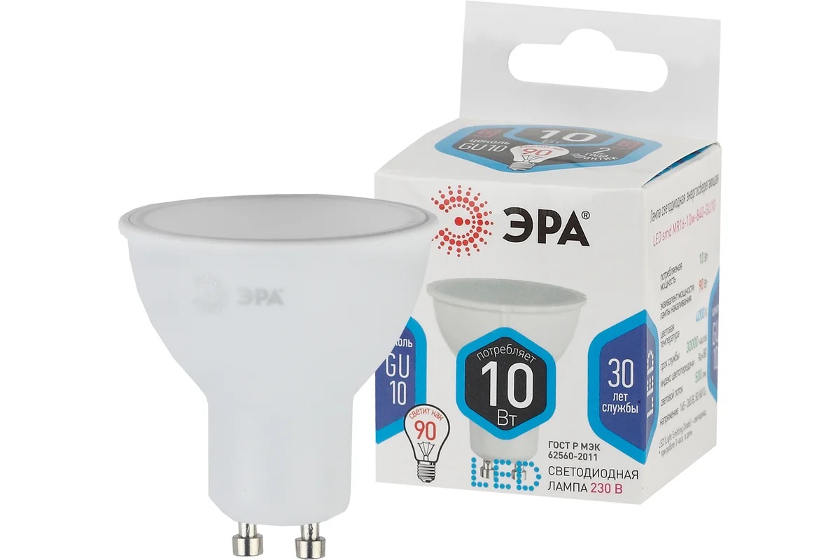 Светодиодная лампа ЭРА LED MR16-10W-840-GU10, софит, нейтральный Б0032998 - современный, качественный и доступный источник света. Позволяет экономить до 90% электроэнергии по сравнению с лампой накаливания с аналогичным световым потоком. Светит ярким белым светом, который максимально приближен к естественному дневному. Идеальна для ежедневного применения в быту. Мгновенное включение. Ровное освещение. Можно использовать как с люстрами, так и со светильниками, в том числе настольными и бра.