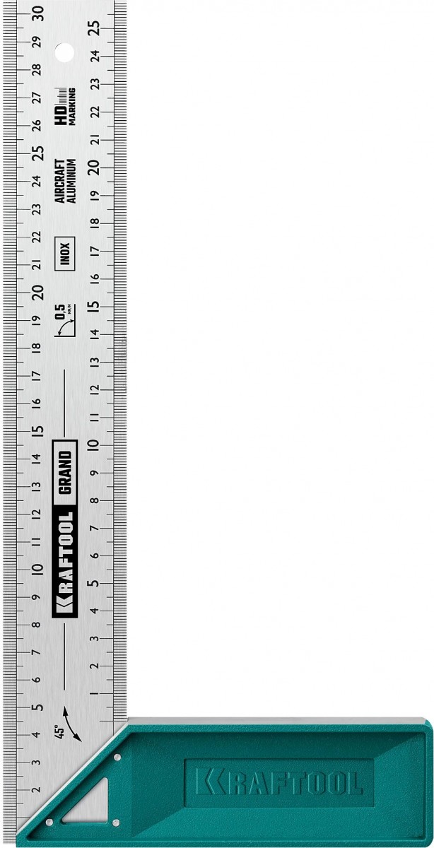KRAFTOOL Grand Высокоточный столярный угольник 300 мм - высокоточный профессиональный инструмент из особо прочной нержавеющей стали. Ударопрочное полотно и литая алюминиевая ручка с фрезерованной рабочей поверхностью. Применяется для разметки и контроля перпендикулярности конструкций при слесарных и прочих строительных работах.