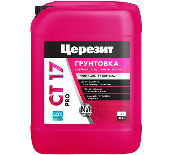 Грунтовка CT 17 PRO предназначена для обработки поверхностей перед нанесением штукатурных и напольных смесей, плиточных клеев и т.д. Применяется для обработки всех видов впитывающих оснований: цементных штукатурок и стяжек, известковых и гипсовых штукатурок, легкого и ячеистого бетона, ангидритных стяжек, кладок из кирпича и природного камня, древесностружечных и древесноволокнистых плит, гипсокартона и т.д. Обладает высокой проникающей способностью, снижает впитывающую способность оснований, связывает пыль, укрепляет поверхность, предотвращает пересыхание тонкослойных выравнивающих смесей, повышает адгезию материалов к основанию, повышает растекаемость напольных смесей и предотвращает появление пузырьков воздуха на выравнивающем слое. Благодаря содержанию пигмента позволяет легко отличить обработанную поверхность. Для версии «Морозостойкая» допускается до 5 циклов замораживания при температуре не ниже –40°C общей продолжительностью не более 2 недель. В случае замораживания выдержать в теплом помещении до полного оттаивания и перемешать. Преимущества: Универсальная: для стен, потолка, полов, влажных зон, внутри и снаружи зданий Укрепляет поверхность и связывает пыль Снижает расход финишных покрытий и повышает их сцепление с основанием Паропроницаемая Желтый оттенок позволяет отличить загрунтованную поверхность Совместима с «теплыми полами» Повышает растекаемость и снижает пересыхание наливного пола и появление трещин Допускается хранение и транспортировка при отрицательных температурах Экологически безопасна Морозостойкая