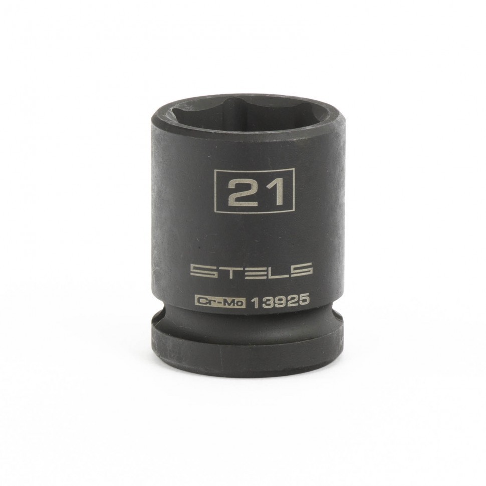Ударная шестигранная головка Stels 13925 размером 21 мм, из стали CrMo, с присоединительным квадратом 1/2 дюйма, — сменная насадка для электрических и пневматических гайковертов. Она пригодится для монтажа и демонтажа крепежных элементов. Ударная головка выдерживает высокие динамические нагрузки, поэтому подходит для интенсивной эксплуатации на строительной площадке, в автомастерской и слесарном цеху.