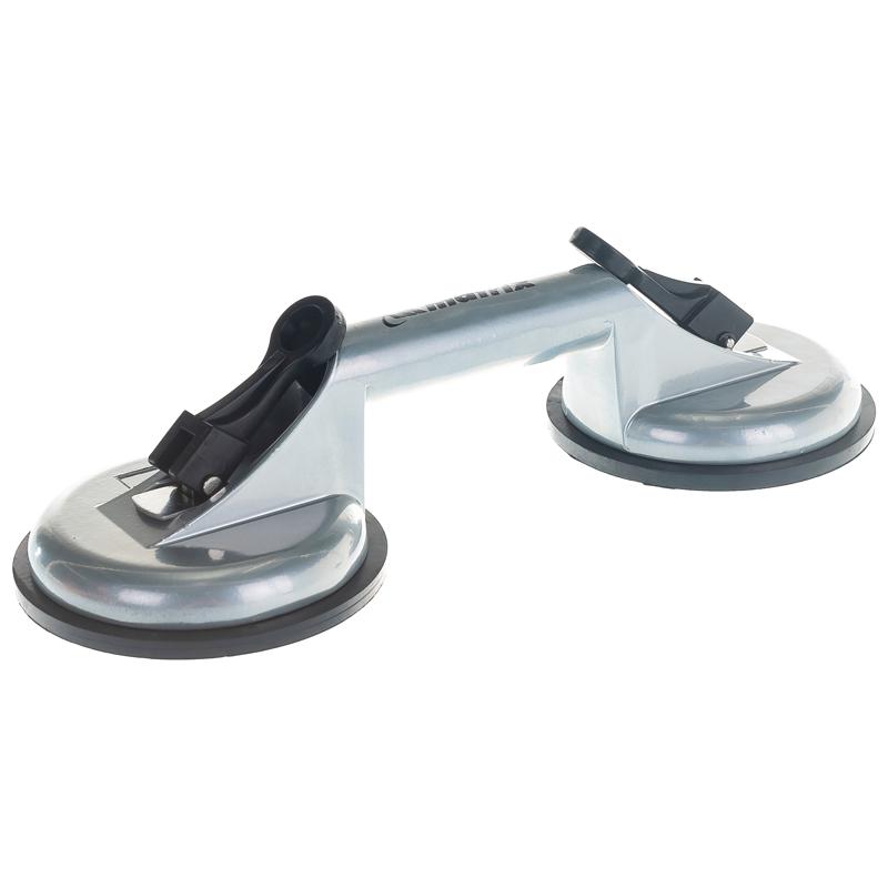 Алюминиевый двойной стеклодомкрат Matrix 875205 используется для подъема, удержания и перемещения гладких пластин и листовых материалов — стекол, зеркал, кафельной плитки, металла, пластика. Имеет две вакуумные присоски, которые бережно и надежно фиксируются на поверхности при помощи зажимов. Такая конструкция позволяет поднимать и долгое время удерживать стеклодомкратом материалы весом до 80 кг. Изделие пригодится мастерам по ремонту, а также будет полезно в быту.