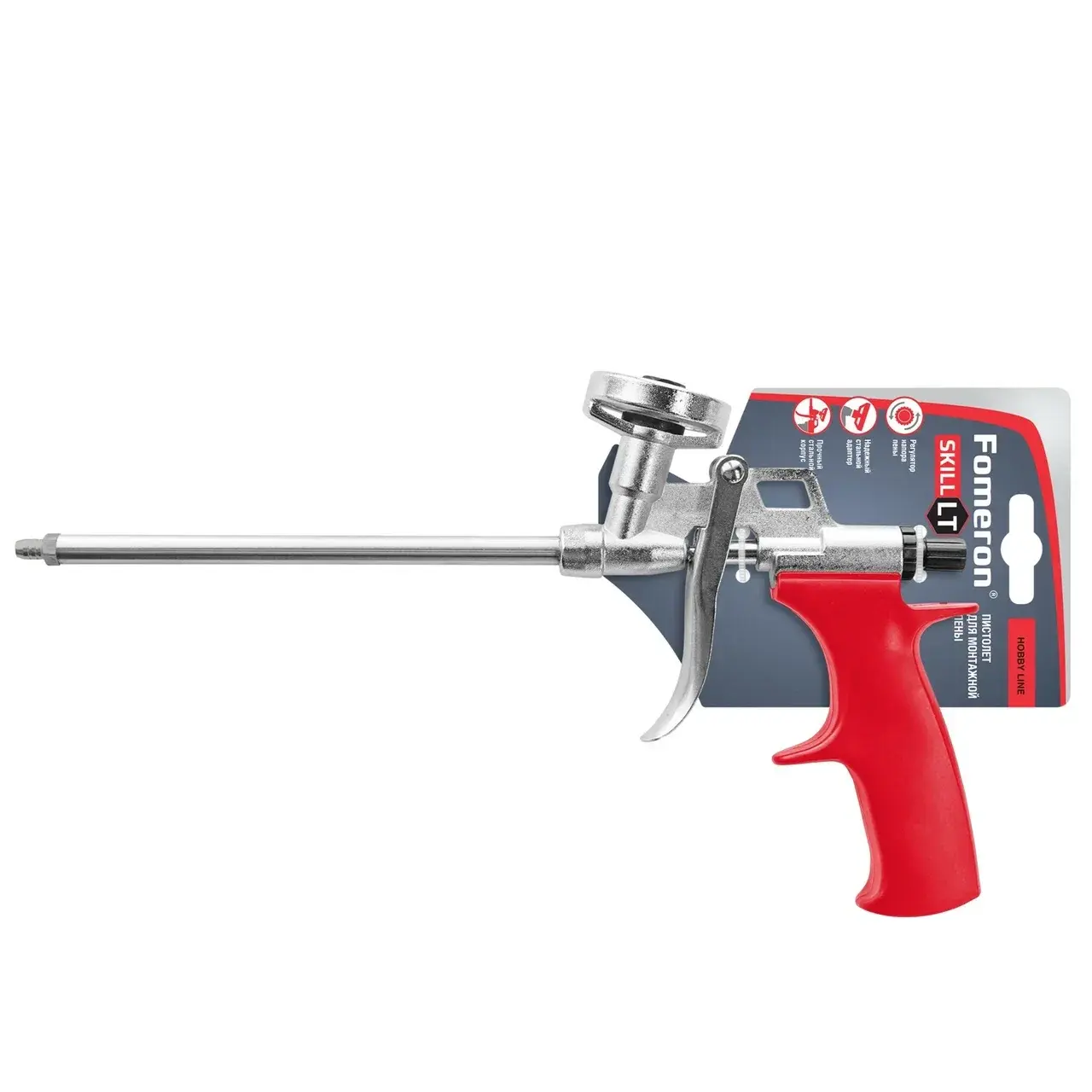 Fomeron Skill LT 590222 – универсальный и надежный пистолет для работы с монтажной пеной, обладает рядом особенностей, которые делают его идеальным выбором для профессиональных строителей и домашних мастеров.Основной материал корпуса пистолета – цельнометаллическая конструкция, обеспечивающая максимальную прочность и долговечность. Дуло изготовлено из нержавеющей стали, однокамерное и имеет короткую длину, что обеспечивает более точное и аккуратное нанесение пены.