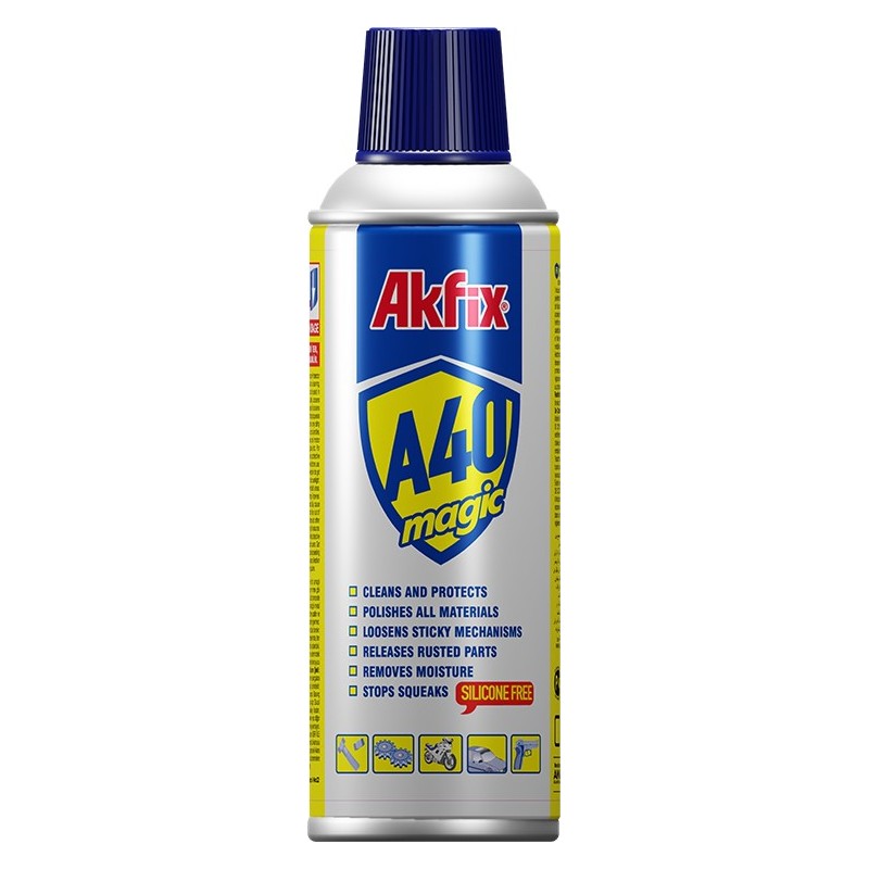 Спрей Magic A40, 400 мл. AKFIX высокоэффективное, быстро-проникающее средство- спрей, позволяющий чистить, смазывать, очищать от ржавчины и отталкивать влагу. Может применяться в промышленных и домашних условиях.