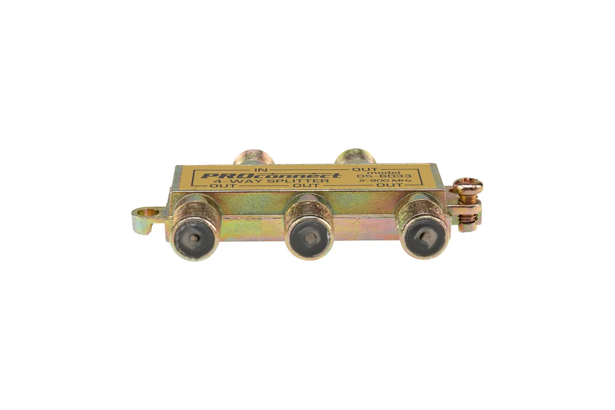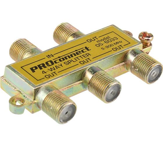 Делитель ТВ PROCONNECT на 4 выхода F разъём 5-900 МГц 05-6033 предназначен для равномерного распределения сигнала, идущего от антенны, на нескольких телевизоров или ресивера. Такое устройство применяется в кабельных системах, а также домах и квартирах, где требуется подключить к одной антенне два или более телевизионных аппарата. Данный ТВ сплиттер на 4 выхода под F разъём 900 МГц имеет четыре выхода для оборудования, соответственно сигнал, поступающий на вход делителя, разделяется на четыре равные части. Подключается этот делитель с помощью стандартного F-разъема. Этот ТВ краб применяют для работы с частотами до 900 МГц. Оптимальное соотношение цена/качество для этого сплиттера позволяет эффективно его использовать в условиях качественного антенного сигнала и ограниченного бюджета на кабельную систему.