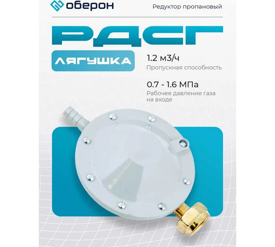 Редуктор пропановый РДСГ Оберон лягушка N4118 предназначен для автоматического поддержания в заданных пределах давления сжиженных углеводородных газов, отбираемых из баллонов. Редуктор присоединяется к вентилю газового баллона ВБ-2 ГОСТ 21804-94, путем накручивания накидной гайки на регуляторе – СП 21,8 LH. Место соединения уплотняется прокладкой.