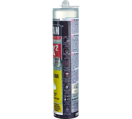 Однокомпонентный полностью прозрачный гибридный клей-герметик на основе МС полимера, не содержит фталатов. 2 в 1! Клеит и герметизирует. Это универсальный продукт с широким спектром применения. Создает эластичный и бесцветный шов. ПРЕИМУЩЕСТВА: - Универсальный прозрачный клей и герметик -️ Образует прозрачный эластичный шов -️ Отличная адгезия к большинству поверхностей -️ Для применения внутри и снаружи помещений -️ Экологичен, нейтрален к чувствительным поверхностям ПРИМЕНЕНИЕ: -️ Склеивание элементов, где требуется невидимое соединение -️ Использование в качестве герметика для различных поверхностей -️ Склеивание таких поверхностей как: бетон, штукатурка, ДСП, дерево, гипс, кирпич, стекло.