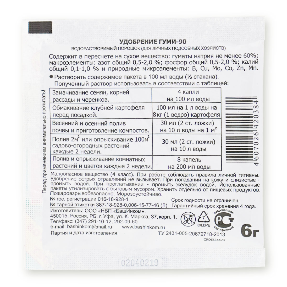 Природное биоактивированное по микроэлементному и молекулярному составу гумусное вещество. Преимущества: Экономичен – упаковки хватает на 30 л рабочего раствора - для полива 6-7 м2 садово-огородных растений, либо на 1 л рабочего раствора для обмакивания 8 кг клубней семенного картофеля перед посадкой, либо на 50 л рабочего раствора при поливе и опрыскивании комнатных растений и цветов до полного смачивания листьев, при замачивании корней рассады и черенков, при замачивании 50 кг семян (100 мл на 100 г семян). Полностью безопасен – не имеет срока ожидания.
