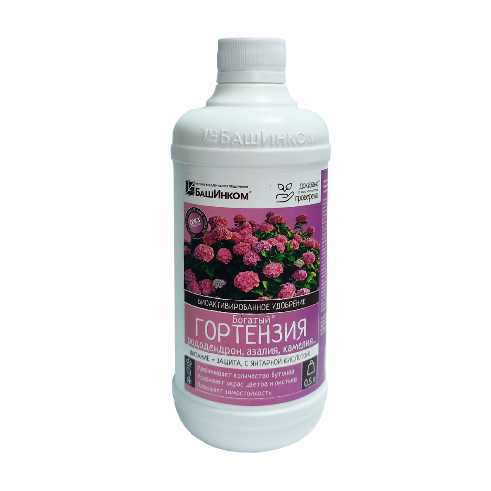 Государственная регистрация №016-13-4033-1 от 16.03.23 до 15.03.2033 выдана МСХ РФ, Сертификация-декларация №РОСС RU Д-RU.РА01.В.14118/22 от 19.04.22 до 18.04.25 выдана ООО "НВП "Башинком" Препарат «Богатый Гортензия» для гортензий, рододендронов, азалий. Это современное инновационное биоудобрение увеличивает количество бутонов, усиливает окрас цветов и листьев, повышает зимостойкость. Это полноценное питание и защита, с янтарной кислотой. Удобрение обладает большим спектром действия: -оптимально понижает Ph почвы -укрепляет корневую систему -стимулирует рост -увеличивает количество бутонов -удлиняет период цветения -усиливает окрас листьев и цветов -повышает устойчивость к болезням и неблагоприятным факторам среды -увеличивает и восстанавливает плодородие почвы