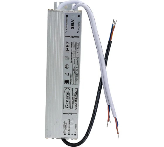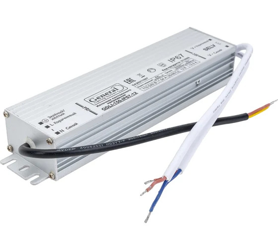 Драйвер светодиодный TM General со степенью защиты IP67 выполнен в компактном и герметичном металлическом корпусе, снабжен защитой от перегрузок и короткого замыкания, а также предназначен для работы в диапазоне от 110 до 240 Вольт.
