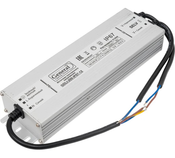 Драйвер светодиодный TM General со степенью защиты IP67 выполнен в компактном и герметичном металлическом корпусе, снабжен защитой от перегрузок и короткого замыкания, а также предназначен для работы в диапазоне от 110 до 240 Вольт.