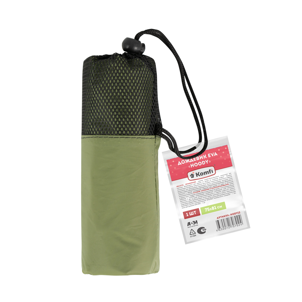 Дождевик HOODY EVA темно-зеленого цвета – идеальный выбор для активного отдыха. Оснащен удобным капюшоном на завязках с фиксатором, который надежно защитит от дождя. У горловины имеет две кнопки для удобного надевания и снимания дождевика. Так же на груди имеется удобный карман на двух кнопках для хранения различных мелочей, включая телефон или кошелек. В комплекте идет чехол для удобного хранения и транспортировки. Плотный материал позволит прослужить дождевику несколько сезонов. Незаменим для активного отдыха: катание на велосипеде, самокате, скейтборде; походы, прогулки и другие активные мероприятия на свежем воздухе.