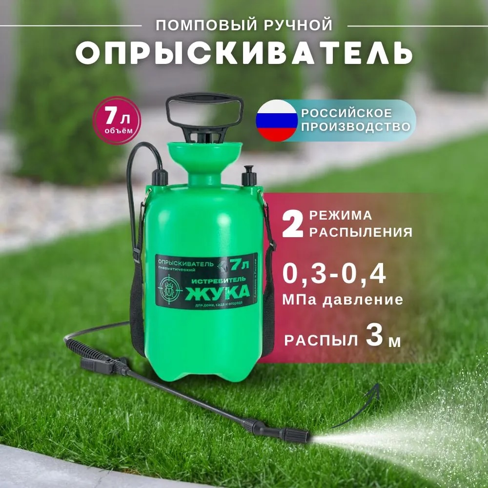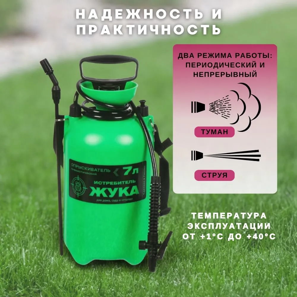 Опрыскиватель пневматический ручной многофункциональный предназначен для мелкокапельного распыления жидкостей в домашнем хозяйстве и на садовых участках Материал: пластик, резина, нейлон Серия: Истребитель жука Пластиковая удочка с насадкой-распылителем Регулируемая насадка-распылитель Ремень для переноски Два режима работы: периодический и непрерывный Опрыскиватель может эксплуатироваться при температуре от +1°С до +40°С и скорости ветра до 3 м/с Производитель: Россия Максимальная вместимость 7 л Номинальное давление 0,3-0,4 МПа