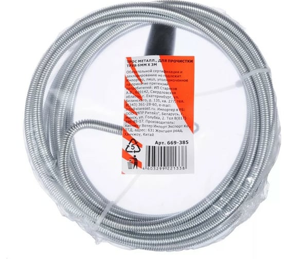 Металлический трос для прочистки труб FALCO 6 мм х 3 м 669-385 прочищает и пробивает засоры в канализационных трубах благодаря специальной спирали на конце, которая делает процесс удаления трубных засоров любого типа быстрым и эффективным.