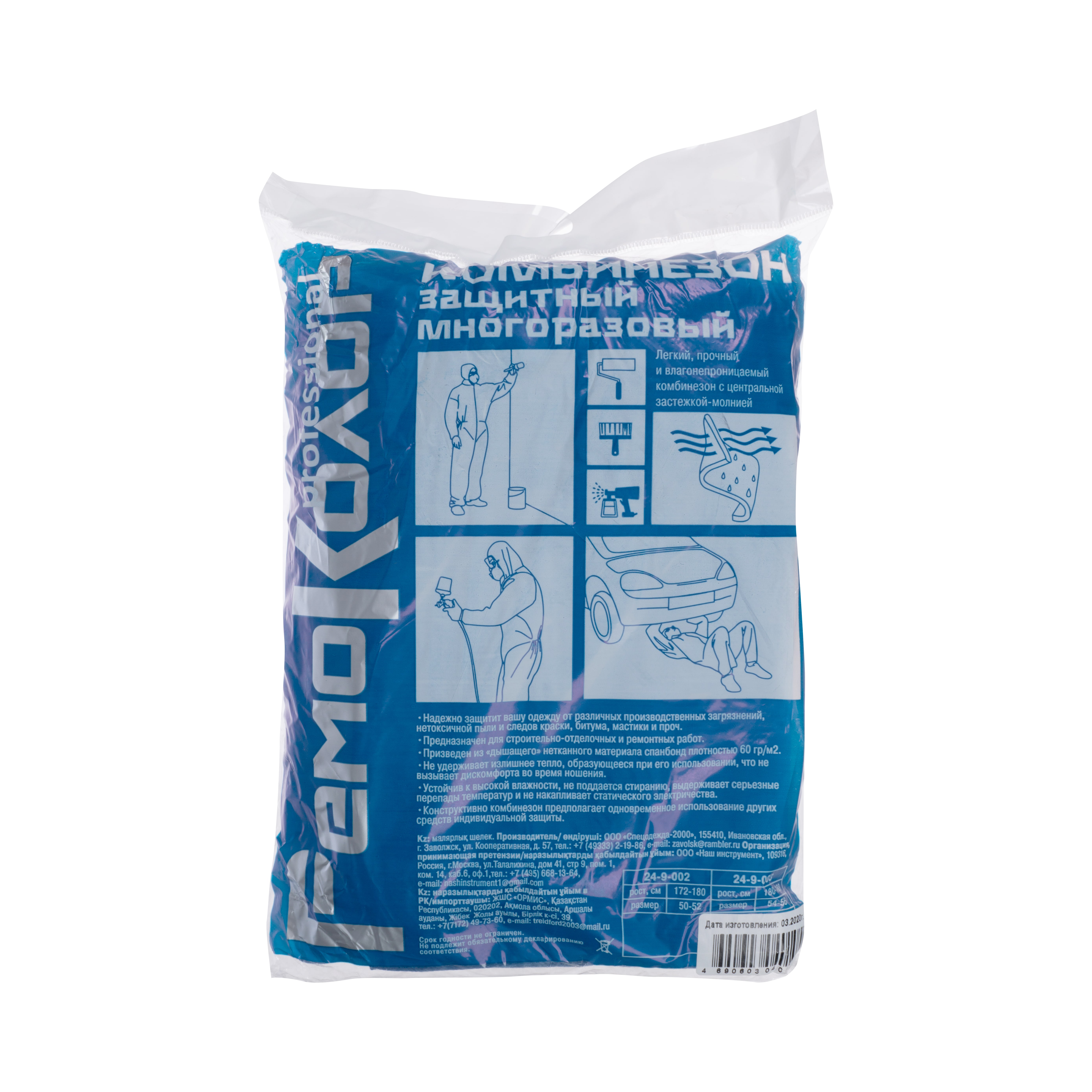 Защитный многоразовый комбинезон РемоКолор размер ХXL 24-9-003 пригодится при строительных и ремонтных работах. Защищает от нетоксичной пыли, следов краски, битума и т.д. Выполнен из материала "спанбонд".