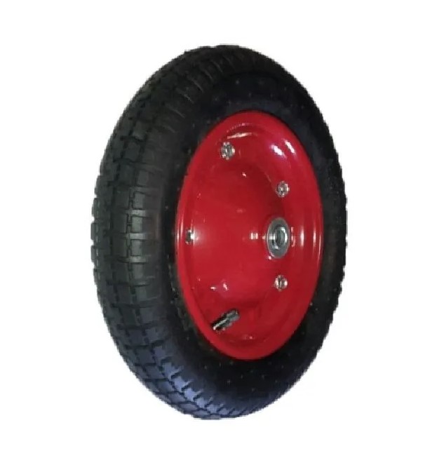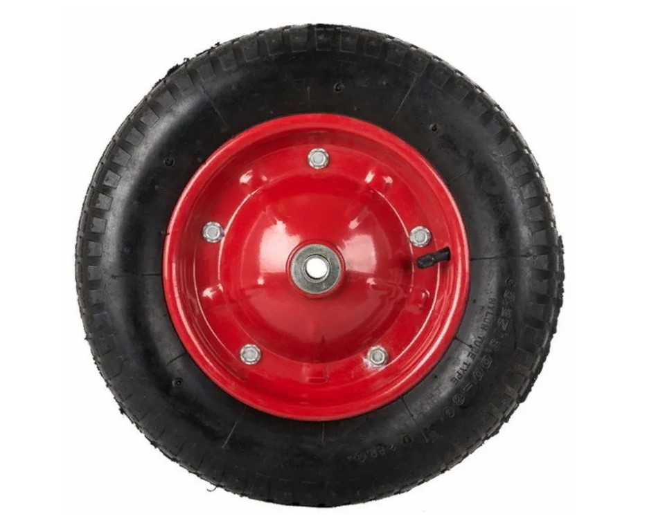 Пневматическое колесо со стальным ободом и подшипником используется для комплектации различных тележек и тачек как бытового, так и промышленного назначения. Конструкция модели включает в себя металлический обод, резиновую шину, пневматическую камеру. Этот тип колес часто можно встретить в садово-огородных хозяйствах. Низкая цена и удобство эксплуатации обеспечили механизму широкую популярность.