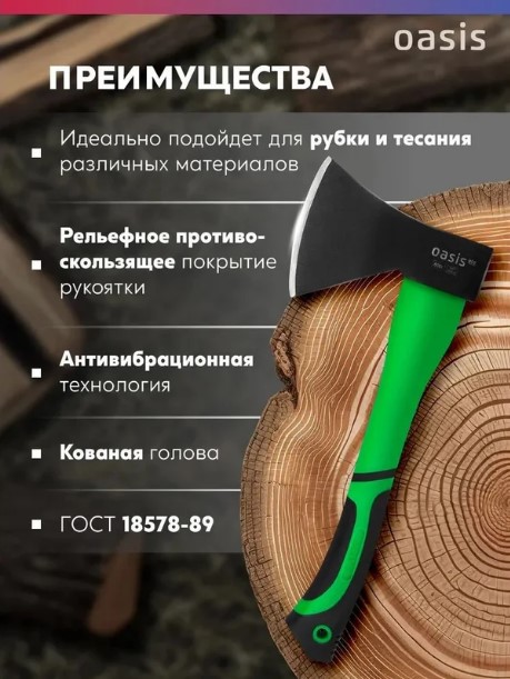 Топор с обрезиненной фибергласовой рукояткой Oasis предназначен для рубки дров, тески и грубой обработки древесины при проведении столярных и плотничных работ.