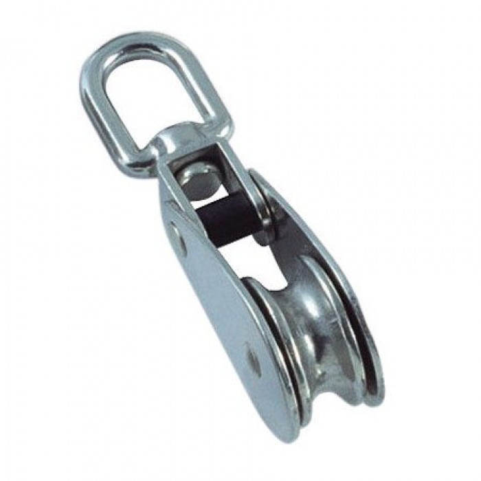 Блок одинарный с металлическим шкивом. Корпус изготовлен из оцинкованной стали, металлический ролик с канавкой по окружности под трос или канат закреплен на оси. Применяют в монтажных, строительных и такелажных работах как средство изменения направления движения троса с целью увеличения грузоподъемности при меньших усилиях на подъем. Не предназначен для грузоподъемных работ.
