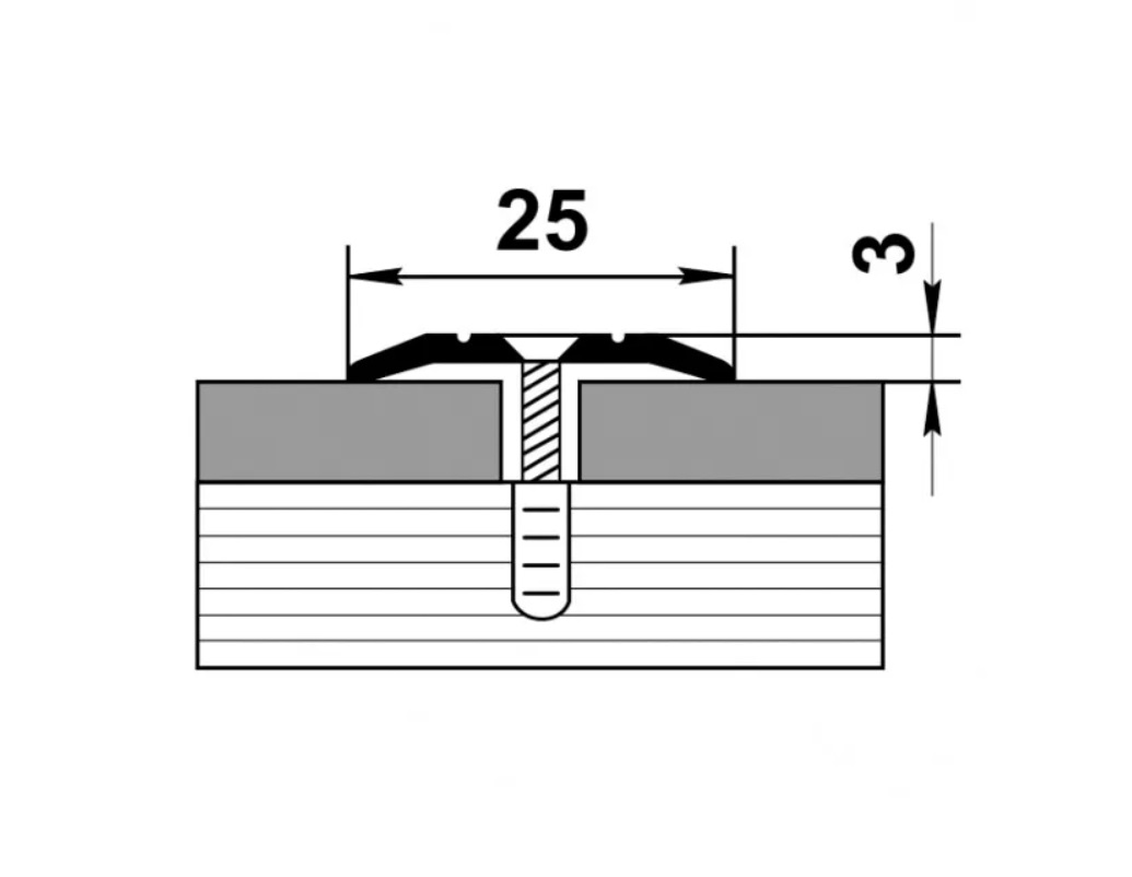 Алюминиевый порожек крепится в проем между двумя напольными покрытиями на саморезы (идут в комплекте)