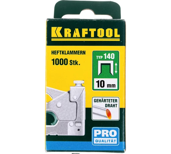 Скобы для степлера, тип 140 (G/11/57) , калибр 20GA, 10мм, 1000шт KRAFTOOL 31680-10 предназначены для крепления тканых материалов (ткани, обивки, холста) к поверхностям из дерева, ДСП и т.п. с помощью скобозабивного пистолета. Скобы с широкой спинкой надежно фиксируют нетканый материал и предотвращают его разрыв. Изготовлены из калиброванной гальванизированной стали с высоким пределом прочности.