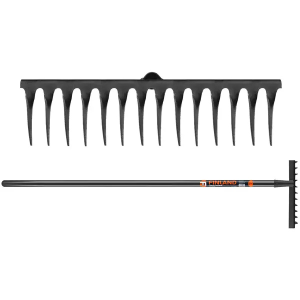 Грабли с черенком Чисто Быстро 1705-Ч FINLAND ПР2617 предназначены для уборки листвы, веток, мусора, а также для рыхления почвы. Широкие зубья надежно удерживают собранный мусор, позволяя убрать территорию за один проход.