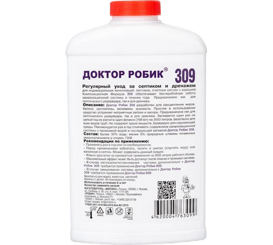 Средство по уходу для септика Доктор Робик 309 изготовлен для расщепления бумаги, жиров, белков, целлюлозы, мочевины, крахмала. Разработан Предназначено как для септического резервуара, так и для дренажа. Используется один раз на целый год, из расчёта один флакон (798 мл.) на 3000 литров. Устраняет неприятные запахи и засоры.