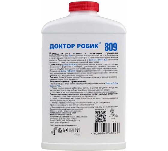 Расщепитель мыла и моющих средств Доктор Робик 809 - содержащий специальные ферменты и бактерии, уничтожающие мыльные скопления и наросты в трубах, ликвидирует пену в септических резервуарах и выгребных ямах. Применение средства предотвратит замыливание и устранит отложения, возникающие в процессе эксплуатации канализационных систем. Рекомендуется для всех видов канализационных систем. Применяется один раз на целый год, из расчёта один флакон (798 мл) на 2000 литров. Не содержит едких веществ. Безвредно для окружающей среды. Рекомендовано раз в год откачивать содержимое канализационной системы и последующей промывкой водой.
