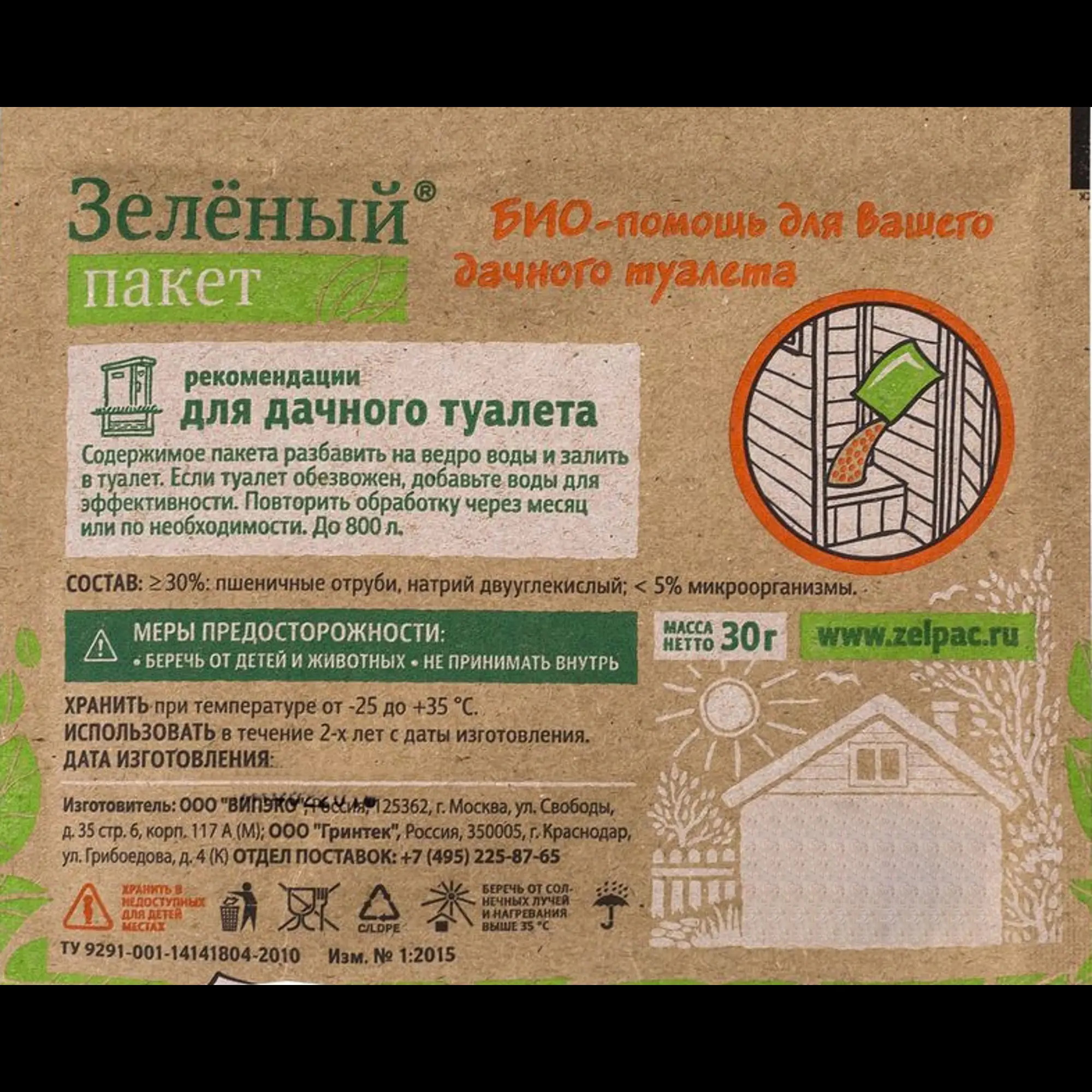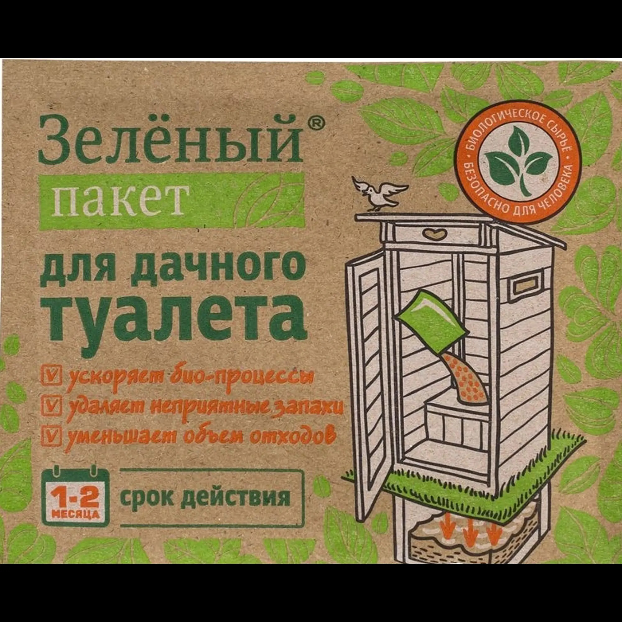 Зеленый пакет для дачного туалета применяется для ускорения процессов разложения и уменьшения объема отходов. Нейтрализует неприятный запах. Подходит для обработки уличных туалетов, труб, сточных ям, установок очистки канализационных сточных вод и биотуалетов.