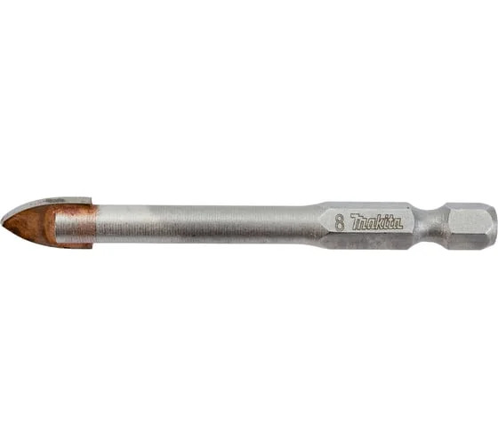 Сверло по стеклу 8X70 Makita D-15970. Сверло относится к стреловидному типу и обеспечивает эффективное сверление стекла и керамики. Сверла идеально подходят для работы в кухнях или ванных комнатах, предотвращают сколы и соскальзывание сверла. В процессе эксплуатации для достижения качественного результата рекомендуется использовать небольшие обороты при сверлении, а также охлаждающую жидкость. Материал изготовления режущего инструмента — твердый сплав, обеспечивающий эффективную работу и оптимальный срок службы. Коническая форма головки позволяет использовать сверло для работы со стеклом и плиткой.