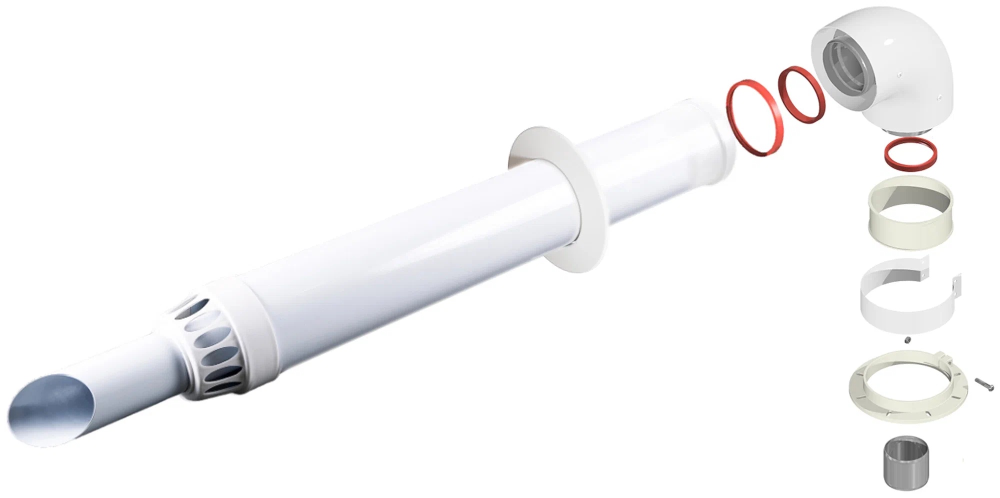 Универсальная коаксиальная система дымоудаления стандартного типа длиной 870 мм. Предназначена для быстрого и полного удаления продуктов сгорания из помещения и притока воздуха из внешней среды. Комплект дымохода 60/100 К-0,75 подходит для любых котлов с закрытой камерой сгорания. Материал корпуса - алюминий/сталь, диаметр 60/100 мм, длина трубы 0,75 м. На корпус со всех сторон нанесена порошковая покраска на профессиональном оборудовании. Универсальное колено подключения к котлу диаметром 60/100 мм в сборе (промежуточное колено, уплотнение, фланец, хомут, адаптер). Подходит для коаксиальных труб котлов с закрытой камерой сгорания всех брендов (кроме бренда Immergas). Материал корпуса – алюминий. Стартовое колено подключения 90°.