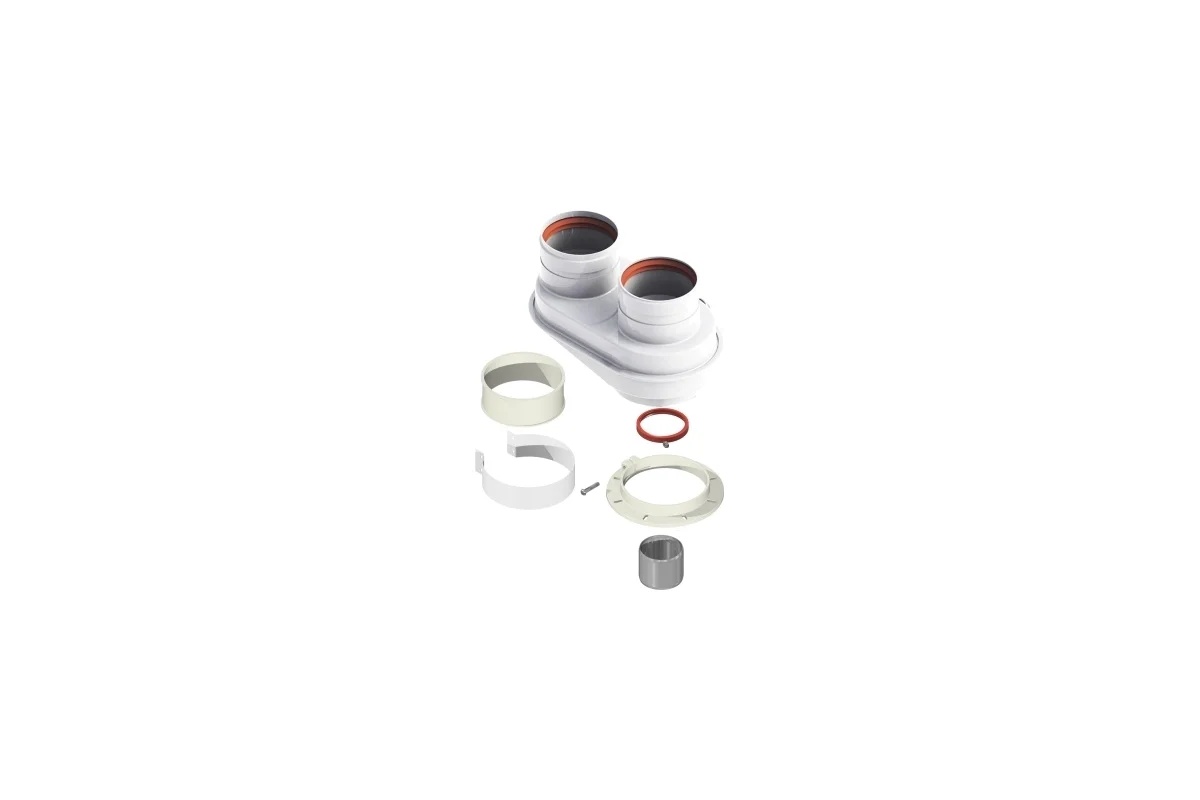 Универсальный стартовый элемент для перехода с коаксиальной системы диаметром 60/100 мм на раздельную систему 80/80 мм в сборе (хомут, фланец, уплотнитель, муфта). Переход типа «Мама – Мама». Материал корпуса - алюминий. Порошковая покраска корпуса адаптера со всех сторон.